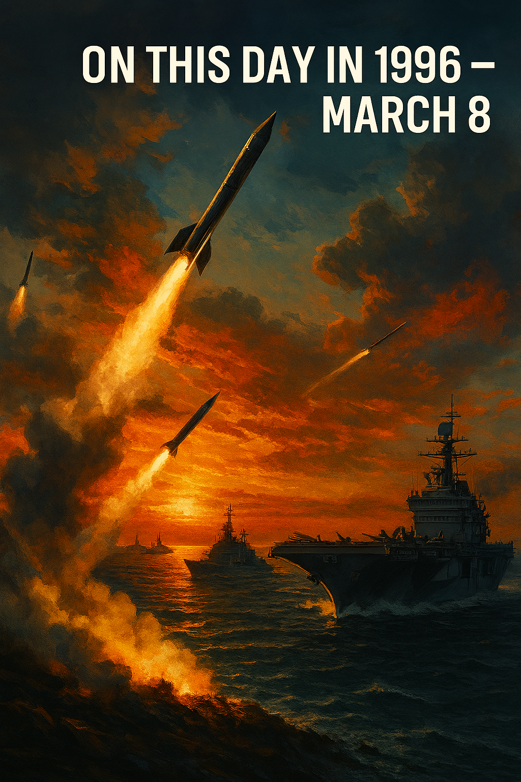 On this day in 1996 and in a dramatic show of force, China launched two M-9 ground-to-ground missiles that landed off Taiwan’s shores, aiming to intimidate pro-independence sentiment ahead of Taiwanese elections.